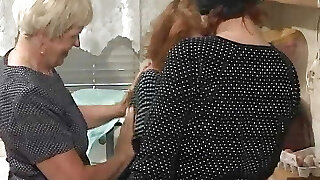 Naked granny in the kitchen drills her silverware before the baker humps her anus hard through