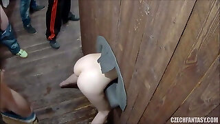 Brunette sexpot with small tits sucks dick thru the gloryhole