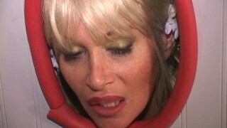 Busty gloryhole MILF clamps man's nipples sucks knob